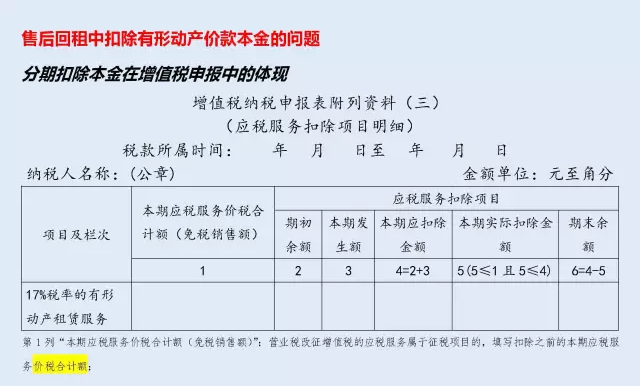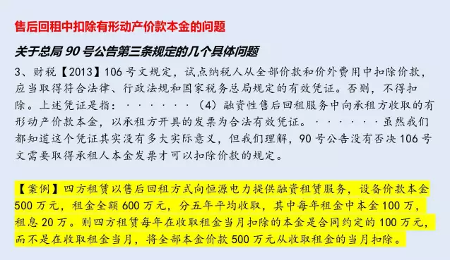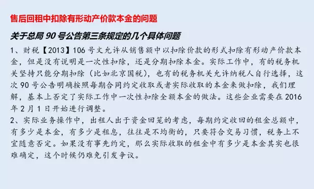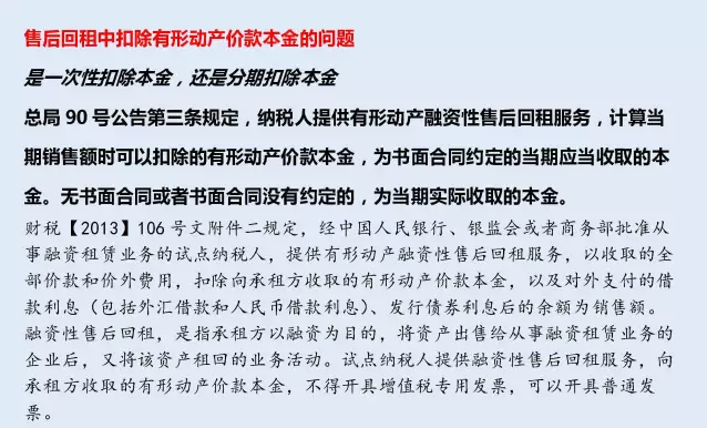 90號(hào)公告第三條規(guī)定,納稅人提供有形動(dòng)產(chǎn)融資性售后回租服務(wù),計(jì)算當(dāng)期銷售額時(shí)可以扣除的有形動(dòng)產(chǎn)價(jià)款本金,為書面合同約定的當(dāng)期應(yīng)當(dāng)收取的本金。無(wú)書面合同或者書面合同沒有約定的,為當(dāng)期實(shí)際收取的本金。