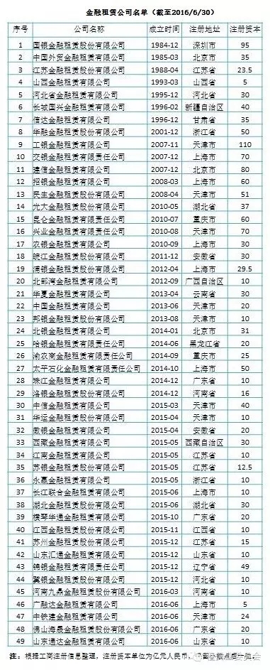 截至2016年上半年,全國(guó)已成立金融租賃公司49家,注冊(cè)資本合計(jì)1518.5億元,實(shí)收資本約為1425億元。