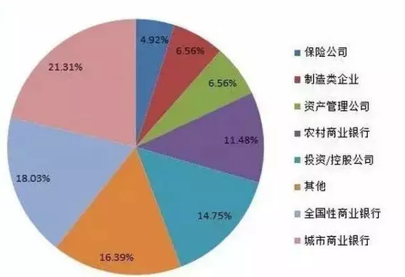 在所有金融租賃公司的控股股東和主要(前兩大)股東中,城市商業(yè)銀行占21.31%、全國(guó)性商業(yè)銀行占18.03%、農(nóng)村商業(yè)銀行占11.48%、投資/控股公司占14.75%。需要說(shuō)明的是,該比例是按照股東的數(shù)量計(jì)算,并非按照投資金額的權(quán)重計(jì)算,參考意義不大。