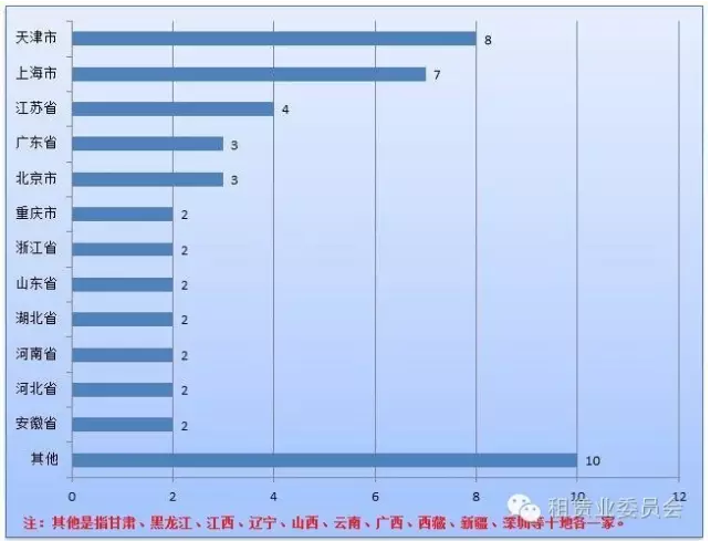 已成立的49家金融租賃公司中,天津和上海最多,分別為8家、7家。
