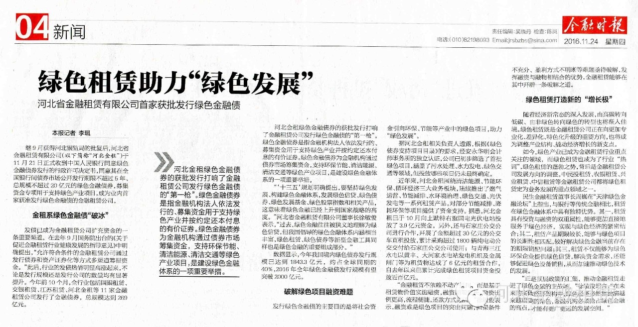 繼9月獲得河北銀監(jiān)局的批復(fù)后,河北省金融租賃有限公司(以下簡稱“河北金租”)于11月21日正式收到中國人民銀行同意綠色金融債券發(fā)行的行政許可決定書,同意其在全國銀行間債券市場公開發(fā)行期限不超過5年、總規(guī)模不超過20億元的綠色金融債券,募集資金專項用于支持綠色產(chǎn)業(yè)項目,成為業(yè)內(nèi)首家獲準(zhǔn)發(fā)行綠色金融債的金融租賃公司。