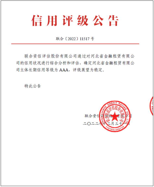 雙AAA!日前,河北省金融租賃有限公司正式獲得聯(lián)合資信評估股份有限公司AAA主體長期信用等級,加上此前持有的中誠信國際信用評級有限公司AAA主體長期信用等級,成為首家獲得雙AAA主體信用等級的金租公司,為自身持續(xù)優(yōu)化融資結(jié)構(gòu)、拓展融資渠道、提升信用形象奠定了基礎(chǔ)。